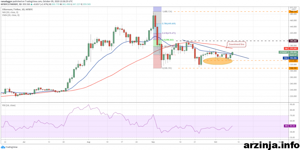 در تاریخ 7 اکتبر، اتریوم موفق به عبور از سطح 333 دلاری شد. هم اکنون گاوها در تلاش هستند که قیمت ها را ثابت نگه دارند. در صورت موفقیت گاوها، حرکت به سمت میانگین متحرک ساده 371 دلاری و سپس به سطح 395 دلاری ممکن خواهد بود.