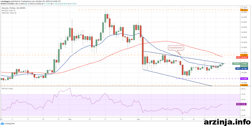 معاملات لایت کوین در سطح میانگین متحرک نمایی 20 روزه (46.7 دلاری) در تاریخ 8 اکتبر پایان یافت که اولین نشانه از قدرت گرفتن این رمزارز است. اما خرس ها اجازه پیشروی بیشتر را به گاوها نخواهند داد و در سطح مقاومتی 51 دلاری، در برابر گاوها مقاومت خواهند کرد.