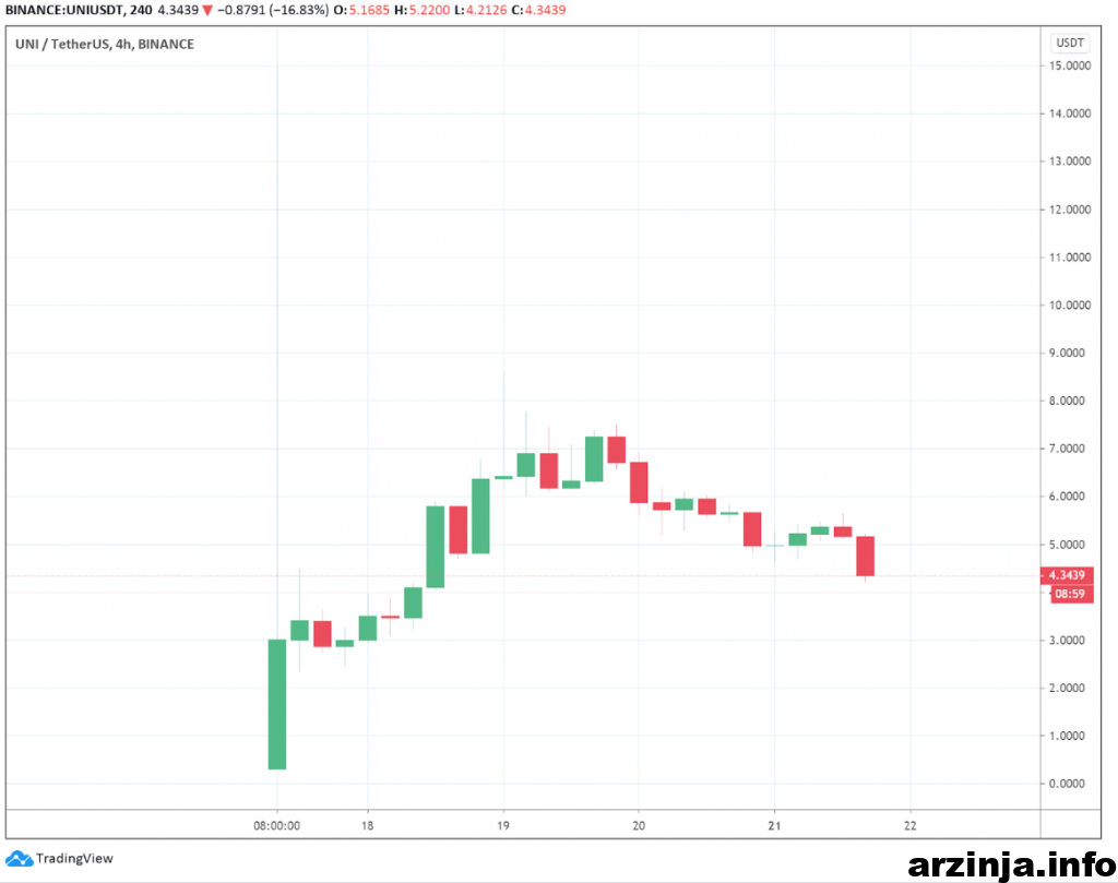 یونی به دلیل لیست شدن زود هنگامش در صرافی های بزرگ، موفق شد که در کمتر از ۵ ساعت از ۰.۳ دلار به ۸.۸ دلار برسد. اما با ریزشی که این ارز تجربه کرد، قیمتش به ۴ دلار سقوط کرد.