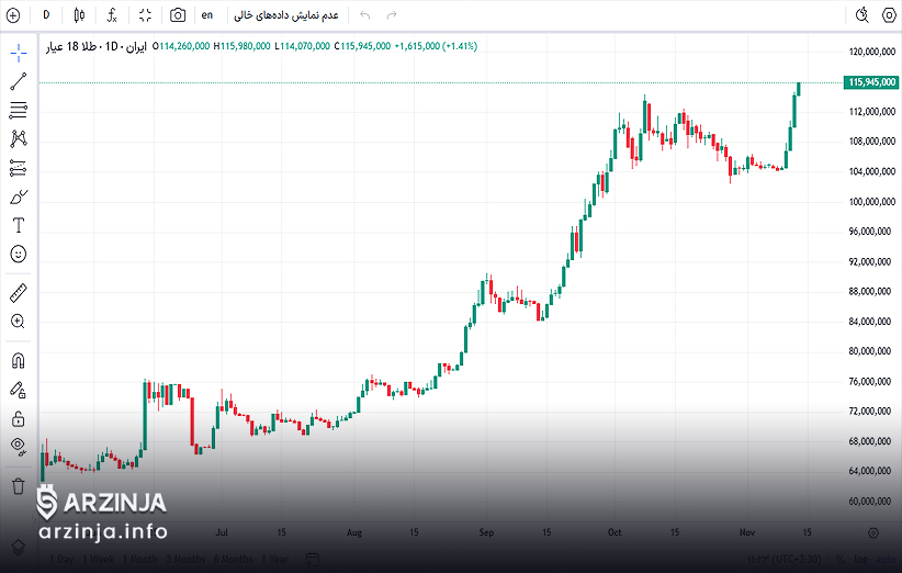 نمودار روزانه طلا ۱۸ عیار نشاندهنده روند صعودی بلندمدت است. از خردادماه سال جاری، قیمت طلا رشد قابل توجهی داشته است. در این راستا، کندلهای سبز غالب بوده و حجم معاملات در اوجهای جدید افزایش یافته است. این مسئله نشاندهنده قدرت خریداران و حمایت از روند صعودی است. گفتنی است، سطح فعلی قیمت حدود ۱۱۶۶۳۸۰۰ تومان قرار دارد. تحلیل نمودار روزانه کمک میکند تا در این حال نقاط ورود و خروج مناسب مشخص شوند. معاملهگران میتوانند با بررسی این نمودار، اصلاحهای کوتاهمدت و نقاط حمایت و مقاومت را پیشبینی کنند و تصمیمات دقیقتری اتخاذ نمایند.