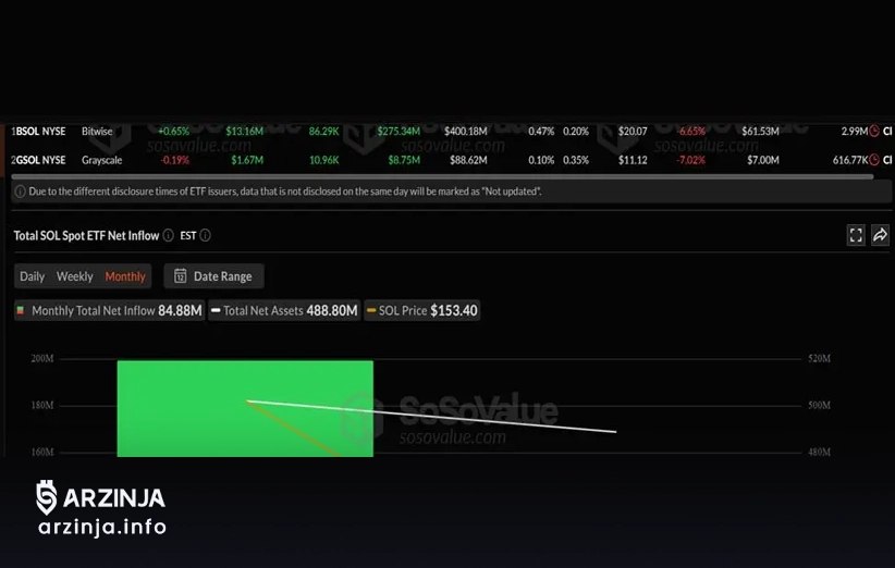 با وجود اُفت کلی بازار، ETFهای سولانا برخلاف ETFهای اسپات ETH و بیت کوین در ایالات متحده، همچنان شاهد ورود سرمایههای جدید هستند. طبق دادههای SoSoValue، سولانا در ماه گذشته حدود ۸۴ میلیون دلار سرمایه تازه جذب کرده است. در مقابل، ETFهای اتریوم طی ۳۰ روز اخیر شاهد خروج ۳۵۵ میلیون دلار سرمایه بودهاند و ETFهای اسپات بیت کوین نیز حدود ۷۶۴ میلیون دلار خروج سرمایه را تجربه کردهاند. تاکنون ETFهای سولانا حدود ۴۸۸.۸ میلیون دلار دارایی خالص دارند و در محدوده ۱۵۳.۴۰ دلار معامله میشوند. این روند باعث شده تا برخی کارشناسان گمانهزنی کنند که نهادهای سرمایهگذاری ممکن است در حال انتقال سرمایه خود به سمت محصولات با بازده بالا مانند سولانا بیتوایز (BSOL) باشند که سود حدود ۷ درصدی ارائه میدهد.