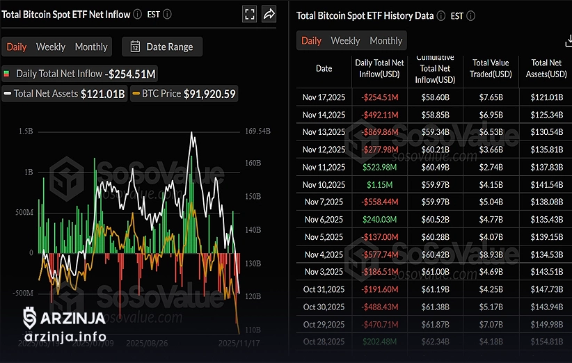 قیمت بیت کوین (BTC) در روز سهشنبه (27 آبان 1404)، پس از کاهش شدید هفته گذشته، به زیر 90 هزار دلار رسید و اصلاح خود را ادامه داد. این اُفت قیمت بهدلیل فروش گسترده و فشار فروش در بازار اتفاق افتاده است. در روز دوشنبه نیز صندوقهای قابل معامله در بورس (ETF) اسپات بیتکوین در ایالات متحده، شاهد خروج 254.54 میلیون دلار سرمایه بودند که ادامه روند برداشتهای هفته گذشته است. این تغییرات به وضوح نشان میدهند که خروج سرمایه از بازار ادامه دارد.