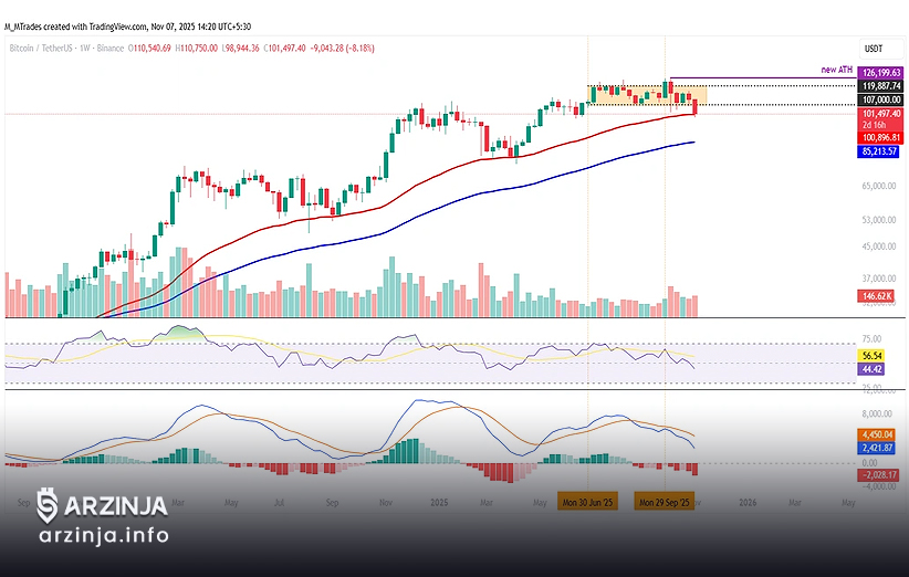 از منظر تحلیل تکنیکال، نمودار هفتگی Bitcoin نشان میدهد که طی پنج هفته گذشته بیش از ۲۰ درصد از اوج تاریخی خود در ۱۲۶۱۹۹ دلار کاهش یافته و در این هفته به کف ۹۸۹۴۴ دلار رسیده و در نزدیکی میانگین متحرکنمایی (EMA) ۵۰ هفتهای در ۱۰۰۸۹۶ دلار در حال آزمایش است. بهطور تاریخی، این سطح همواره بهعنوان حمایت کلیدی برای بیت کوین عمل کرده است. در صورت شکسته شدن این سطح، BTC میتواند اصلاح خود را تا میانگین متحرکنمایی ۱۰۰ هفتهای در سطح ۸۵۲۱۳ دلار ادامه دهد.