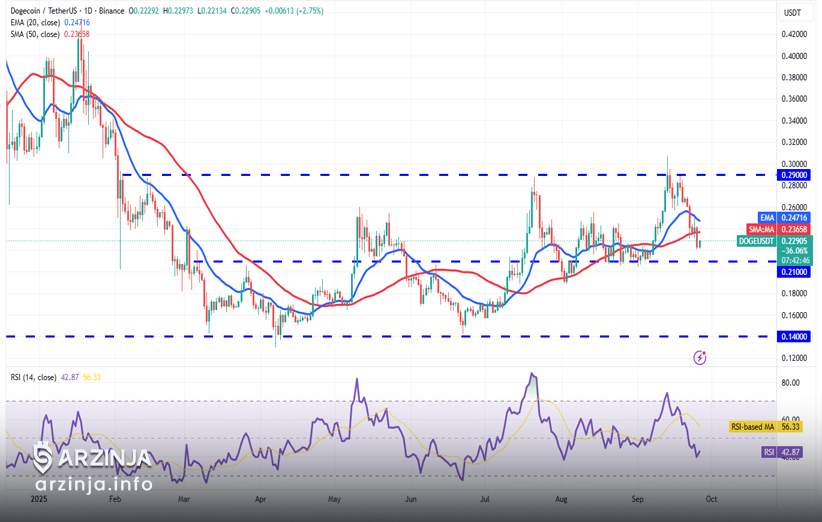 در تحلیل دوج کوین (DOGE) ناتوانی خریداران در عبور دادن قیمت این میم کوین (Memecoin) از میانگین متحرک نمایی (EMA) ۲۰روزه (۰.۲۴ دلار) در روز چهارشنبه (24 سپتامبر) نشان میدهد که فروشندگان در سطوح بالاتر فعال هستند و فشار عرضه ادامه دارد. این موضوع بیانگر آن است که خرسها (فروشندگان) همچنان در کنترل بازار باقی ماندهاند و اجازه رشد پایدار را نمیدهند.