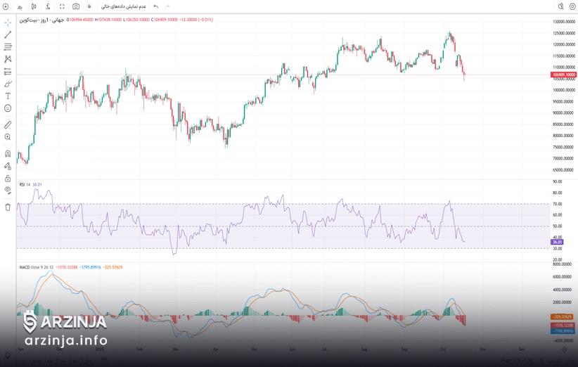 هرچند تمرکز اصلی این مقاله بر تحلیل فاندامنتال است، اما دادههای تحلیل تکنیکال نیز اهمیت دارند. نمودار روزانه بیت کوین در ماه اکتبر 2025 نشان میدهد که شاخص قدرت نسبی (RSI) نزدیک به محدوده 36 قرار دارد که حاکی از اشباع نسبی فروش است. در عین حال، اندیکاتور مکدی (MACD) در حال نشان دادن واگرایی مثبت است. اگرچه ممکن است در کوتاهمدت فشار نزولی ادامه یابد، اما چشمانداز میانمدت همچنان صعودی تلقی میشود.