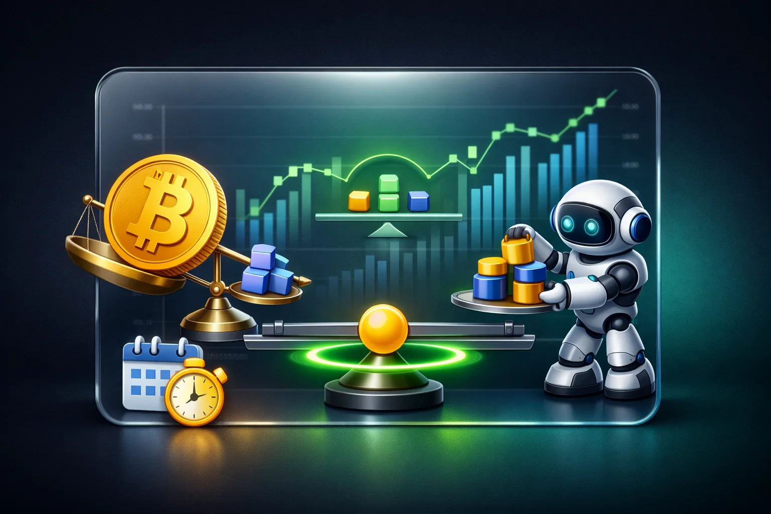 مثال ساده: فرض کنید پرتفولیوی ۱۰۰۰ دلاری با تخصیص ۶۰٪ BTC و ۴۰٪ ETH دارید. بعد از ۳ ماه، BTC 80٪ رشد کرده و ETH 20٪. حالا تخصیص شما ۶۸٪ BTC و ۳۲٪ ETH شده. ریبالانس یعنی بخشی از BTC را بفروشید و ETH بخرید تا به ۶۰/۴۰ برگردید.
