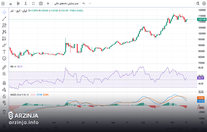 در بازه اخیر، تتر در بازار ایران الگویی مشابه فاز تجمیعی (Consolidation) را شکل داده است. نوسانات بین 108 هزار تا 115 هزار تومان بدون شکست قاطع در هر دو جهت ادامه دارد. این الگو معمولاً پیشزمینه حرکات بزرگتر بعدی است. همچنین، در کندلهای اخیر، تشکیل چند کندل با سایه (Shadow) پایینی بلند نشاندهنده ورود خریداران در سطوح پایینتر است. در نتیجه، اگر کندل روزهای آینده با حجم بالاتر بسته شود، احتمال بریکآوت مقاومت بالایی زیاد خواهد بود. در غیر این صورت، فاز نوسانی ادامه خواهد یافت.