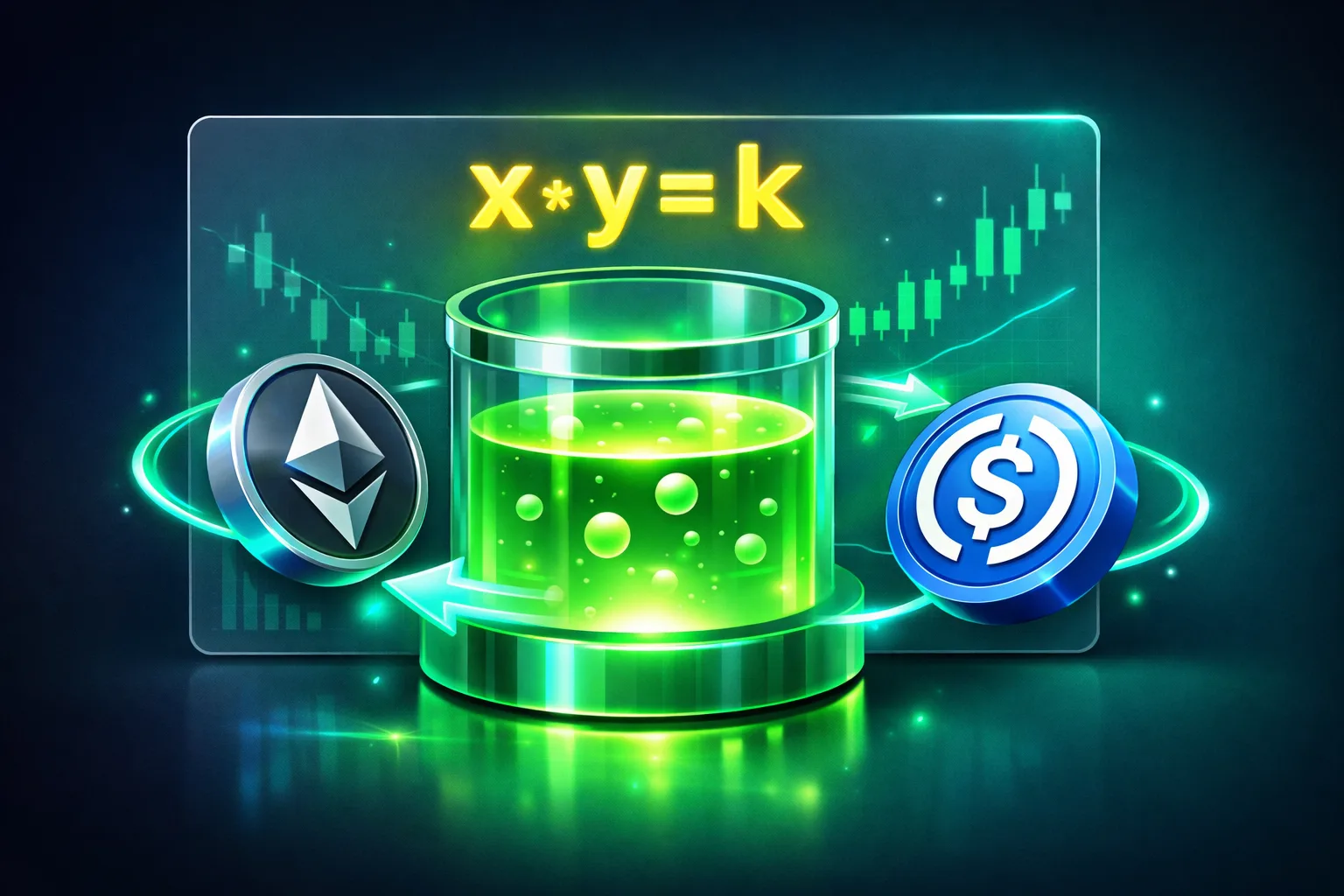 این فرمول اساس کار اکثر AMMهاست. x مقدار توکن اول، y مقدار توکن دوم، و k یک عدد ثابت است. هر معاملهای که انجام شود، حاصلضرب x و y باید همیشه برابر k بماند. این مکانیسم بهصورت خودکار قیمت را با توجه به عرضه و تقاضا تنظیم میکند.