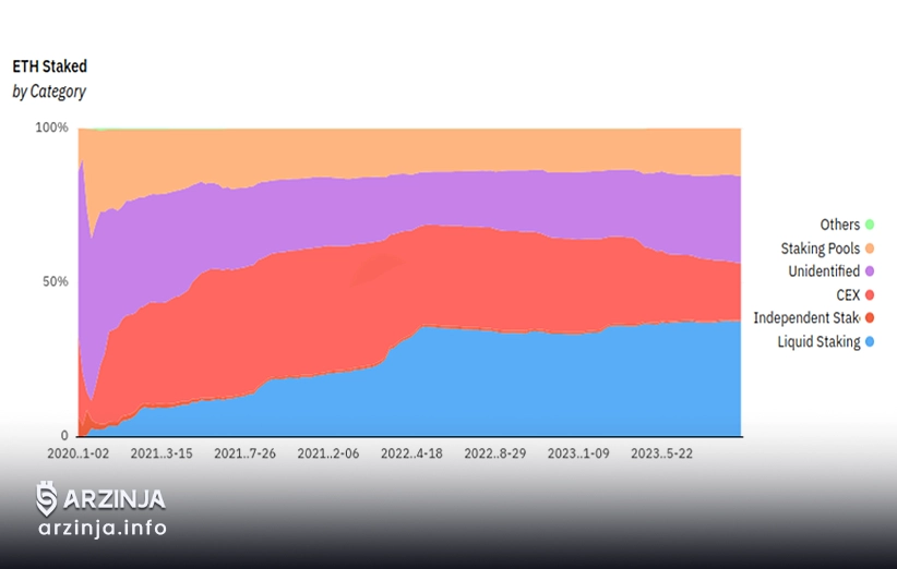 از جمله مشکلات دیگری که اتریوم با آن دست و پنجه نرم میکند، میتوان به پلتفرمهای استیکینگ نقدینگی (liquidstaking protocols) اشاره کرد. همانطور که گفته شد برای تبدیل شدن به یک اعتبار سنج شبکه به 32 اتر نیاز است که رقم کمی نیست. برای رفع این مشکل پلتفرمهایی مانند لیدو فایننس (LDO) و راکت پول ایجاد شدند که امکان مشارکت در شبکه را با رقمهای کمتر فراهم میکنند. طبق دادههای دون آنالیتیکس بیش از 50 درصد از اترهای استیک شده در پلتفرمهای استیکینگ نقدینگی قرار دارند. این موضوع نگرانیهایی را ایجاد میکند؛ زیرا به دست گرفتن کنترل پروتکلی مانند لیدو میتواند به هکرها امکان حمله 51 درصدی را بدهد.